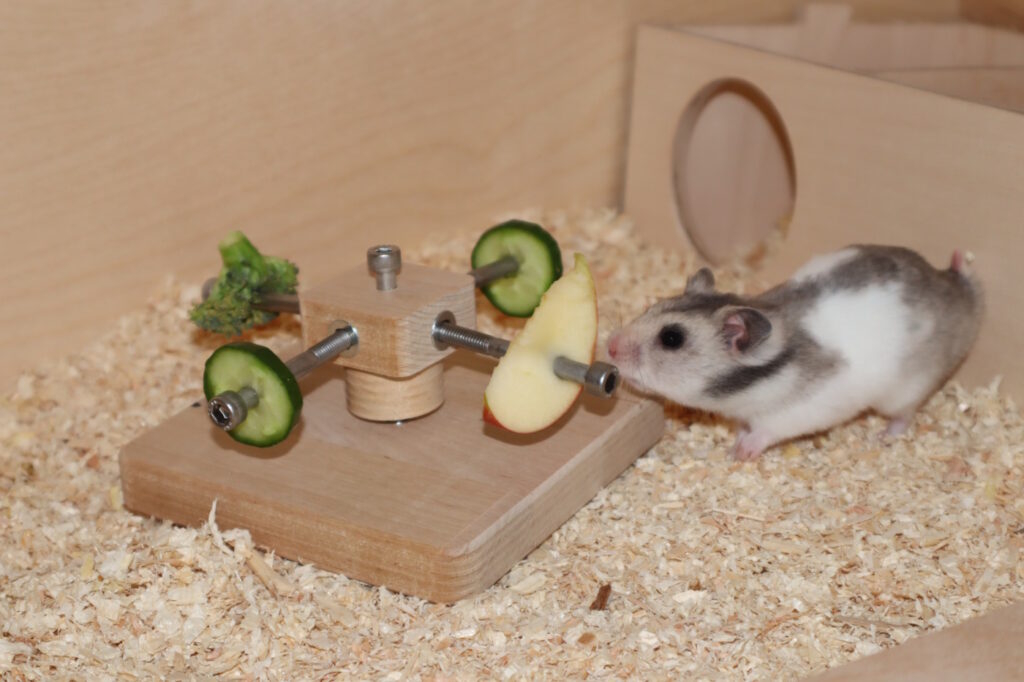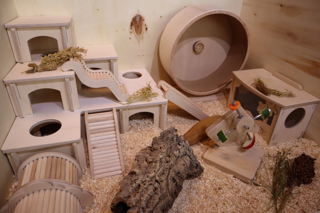 Im Hamsterstall wäre es den Tieren sehr langweilig und sie laufen dann vielleicht so lange im Laufrad, dass es bereits schädlich ist. Besser ist es, wenn etwas Erlebnisspielzeug im Hamsterstall steht.